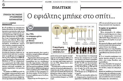 Αυξάνεται με γεωμετρική πρόοδο ο αριθμός των υπερχρεωμένων νοικοκυριών, σύμφωνα με τα στοιχεία της Γραμματείας Καταναλωτή της ΓΣΕΕ. Στελέχη της Γραμματείας υποστηρίζουν ότι τα υπερχρεωμένα νοικοκυριά, πριν από 2,5 χρόνια ήταν στο 10%, ενώ σήμερα έχουν εκτοξευθεί στο 65%. Ακόμη εκτιμούν ότι όσοι έλαβαν στεγαστικό
