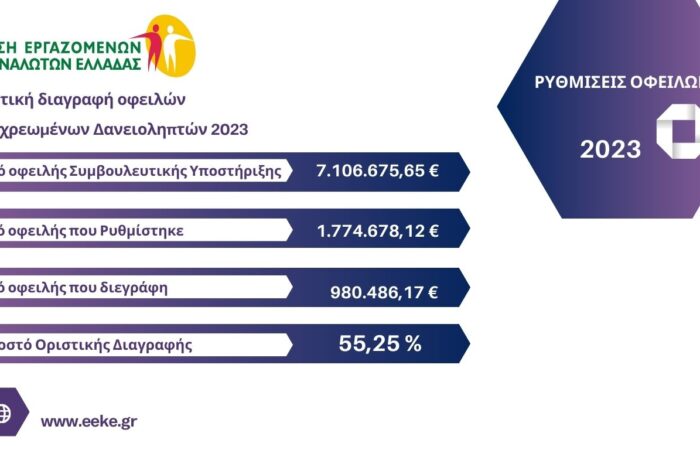 Σε 7.106.675,65 € ανέρχεται το ποσό των οφειλών προς πιστωτικά ιδρύματα, funds και εισπρακτικές, όσων καταναλωτών απευθύνθηκαν στην ΕΕΚΕ κατά το έτος 2023. Συγκεκριμένα το 2023 η Ένωση Εργαζομένων Καταναλωτών Ελλάδας της ΓΣΕΕ: Υποστήριξε συμβουλευτικά δανειολήπτες με οφειλές ύψους 7.106.675,65 € Ρύθμισε οφειλές των μελών