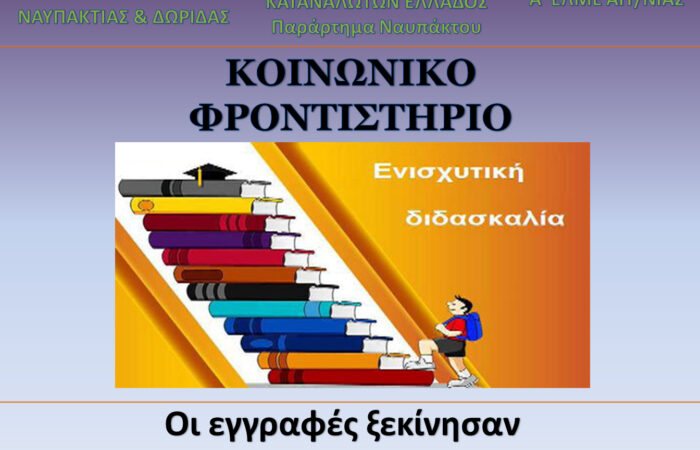 ΔΕΛΤΙΟ ΤΥΠΟΥ Το Ε.Κ.Ν.Δ. και η Ένωση Εργαζομένων Καταναλωτών Ελλάδας-Παράρτημα Ναυπακτίας & Δωρίδας σε συνεργασία με την Α΄ ΕΛΜΕ ανακοινώνουν την έναρξη του Κοινωνικού Φροντιστηρίου για το σχολικό έτος 2013-2014 παρέχοντας δωρεάν ενισχυτική διδασκαλία σε μαθητές Γυμνασίου και Λυκείου οικογενειών που αντιμετωπίζουν οικονομικές δυσκολίες. Καλούμε