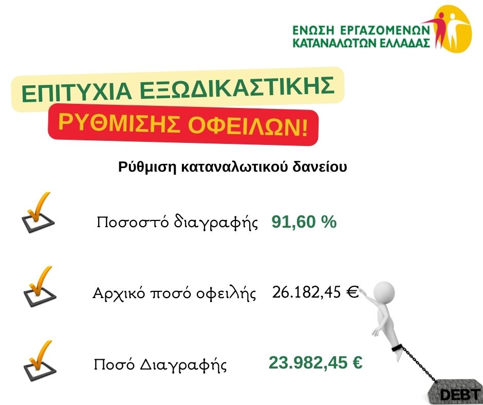 Σε μία ακόμα επιτυχημένη ρύθμιση καταναλωτικού δανείου προχώρησε η Ένωση Εργαζομένων Καταναλωτών Ελλάδας της ΓΣΕΕ. Το χρέος του καταναλωτή ανερχόταν σε 26.182,45€ τα οποία αδυνατούσε να αποπληρώσει εξαιτίας του χαμηλού εισοδήματός της. Με τη διαμεσολάβηση της ΕΕΚΕ, διαγράφηκε το 91,60% του δανείου, δηλαδή 23.982,45€