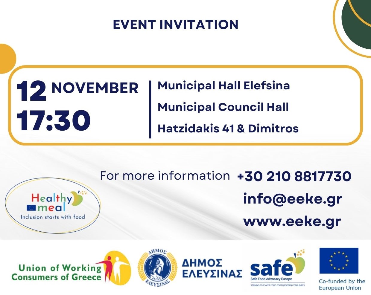 The Union of Working Consumers of Greece and the Municipality of Elefsina invites you on Tuesday, November 12th, at 18.00 CEST, in the event Healthy nutrition and social inclusion of vulnerable consumers