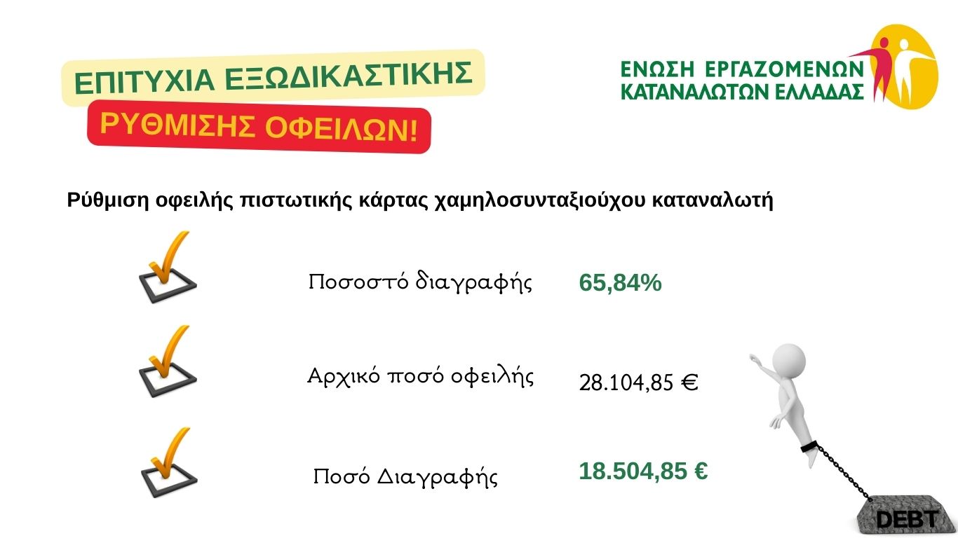 Με επιμονή και θέληση η Ένωση Εργαζομένων Καταναλωτών Ελλάδας της ΓΣΕΕ, συνεχίζει να στηρίζει υπερχρεωμένους δανειολήπτες που αδυνατούν λόγω των χαμηλών εισοδημάτων τους αλλά και του αυξημένου κόστους διαβίωσης να ανταπεξέλθουν στις τραπεζικές τους υποχρεώσεις.
