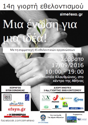 Η Ένωση Εργαζομένων Καταναλωτών Ελλάδας συμμετέχει στην 14η Γιορτή για τον Εθελοντισμό- Σάββατο 17/09/2016, 10.00-19.00, Πλ. Κλαυθμώνος, στο κέντρο της Αθήνας