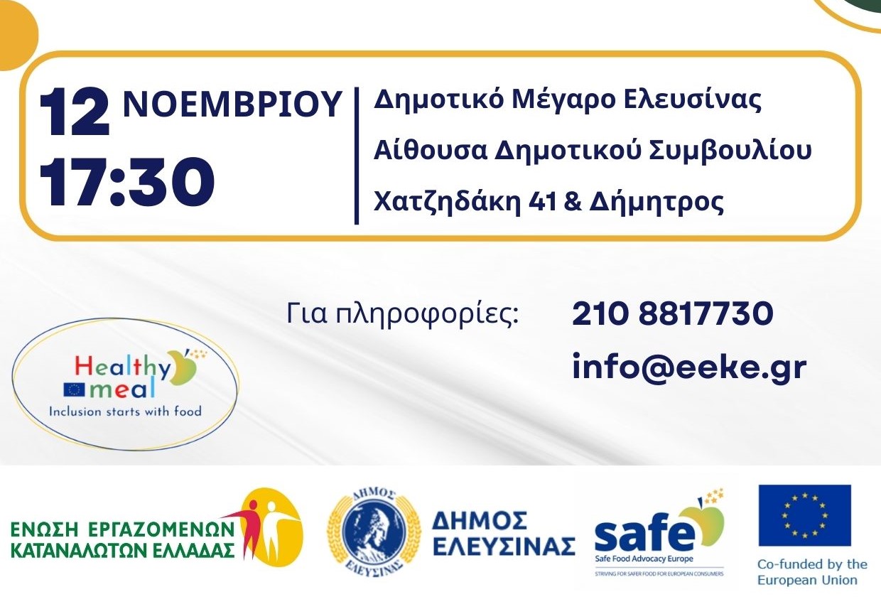 Η Ένωση Εργαζομένων Καταναλωτών Ελλάδας και o Δήμος Ελευσίνας, σας καλούν την Τρίτη 12 Νοεμβρίου και ώρα 18.00 σε υβριδική εκδήλωση με τίτλο Υγιεινή διατροφή & κοινωνική ένταξη ευάλωτων καταναλωτών.