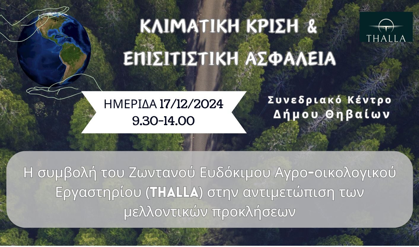 Σας προσκαλούμε στην εναρκτήρια ημερίδα του έργου Thalla όπου μέλη της επιστημονικής κοινότητας, εκπρόσωποι των καταναλωτών, των αγροτών, των φορέων τοπικής αυτοδιοίκησης και της κοινωνίας των πολιτών θα συζητήσουν για τις μελλοντικές προκλήσεις γύρω από την κλιματική αλλαγή, την επισιτιστική ασφάλεια και τον ρόλο που μπορεί να διαδραματίσει το THALLA στις τοπικές κοινωνίες με καινοτόμες δράσεις και παρεμβάσεις.