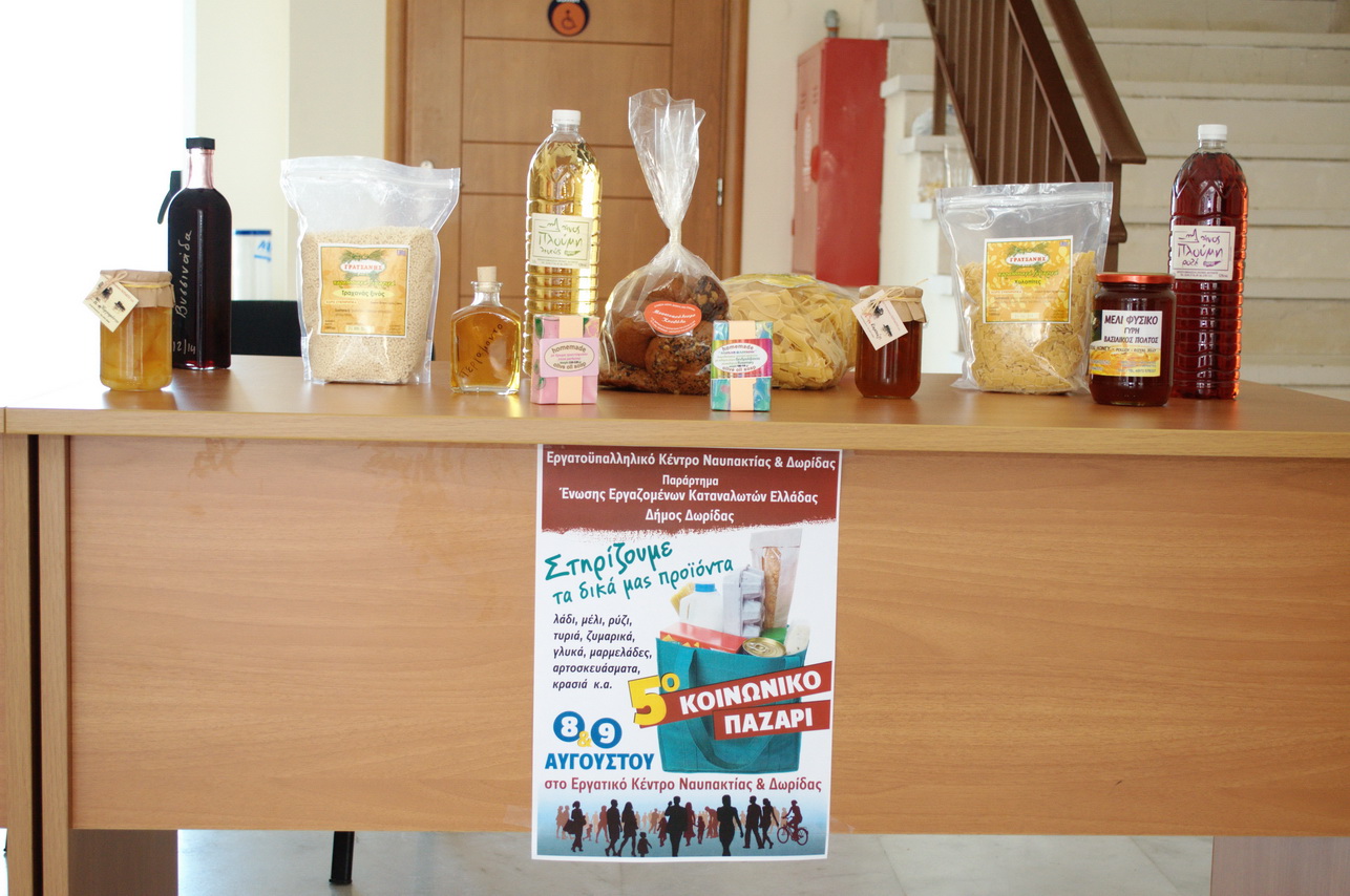 Το 5ο Κοινωνικό Παζάρι  θα πραγματοποιηθεί την Πέμπτη 8 &  Παρασκευή 9 Αυγούστου 2013 στο Εργατικό Κέντρο Ναυπακτίας & Δωρίδας (Αποκαύκου 16, Ναύπακτος) και ώρες 8.00 – 13.30 & 17:30 – 21:00