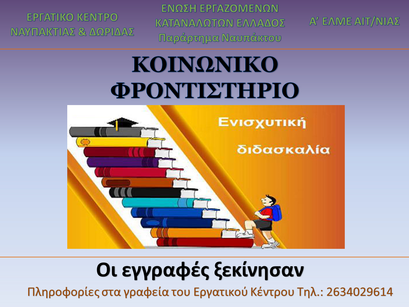 Το Ε.Κ.Ν.Δ. και η Ένωση Εργαζομένων Καταναλωτών Ελλάδας-Παράρτημα Ναυπακτίας & Δωρίδας σε συνεργασία με την Α΄ ΕΛΜΕ ανακοινώνουν την έναρξη του Κοινωνικού Φροντιστηρίου για το σχολικό έτος 2013-2014 παρέχοντας δωρεάν ενισχυτική διδασκαλία σε μαθητές Γυμνασίου και Λυκείου οικογενειών που αντιμετωπίζουν οικονομικές δυσκολίες.