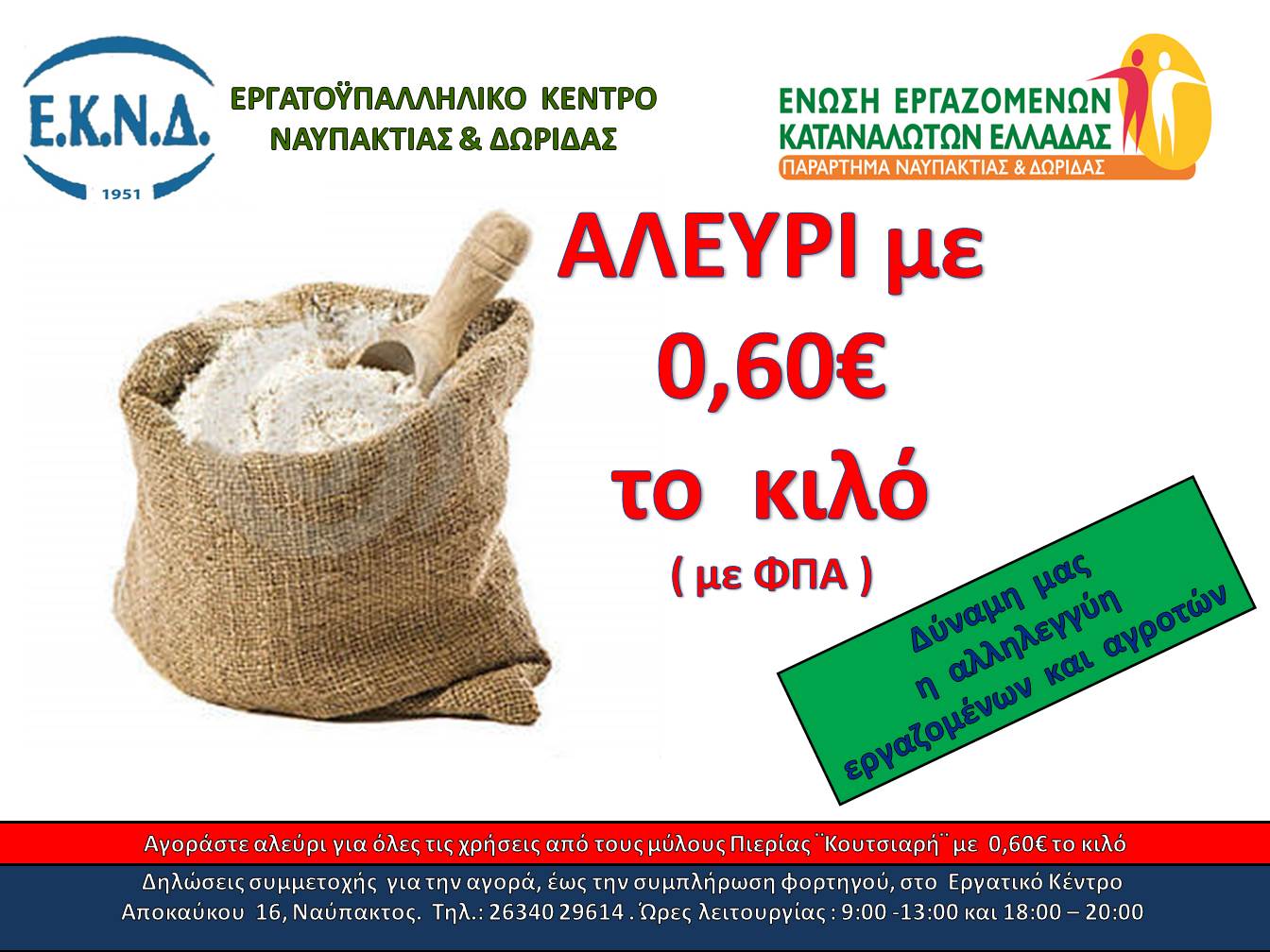 Το Ε.Κ.Ν.Δ. και η Ένωση Εργαζομένων Καταναλωτών Ελλάδας – Παράρτημα Ναυπακτίας & Δωρίδας στο πλαίσιο της διάθεσης προϊόντων «Χωρίς Μεσάζοντες» ανακοινώνουν την έναρξη παραγγελιών αλευριού.
