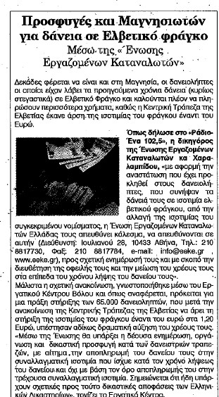 Προσφυγές και Μαγνησιωτών για δάνεια σε Ελβετικό Φράγκο μέσω της <>